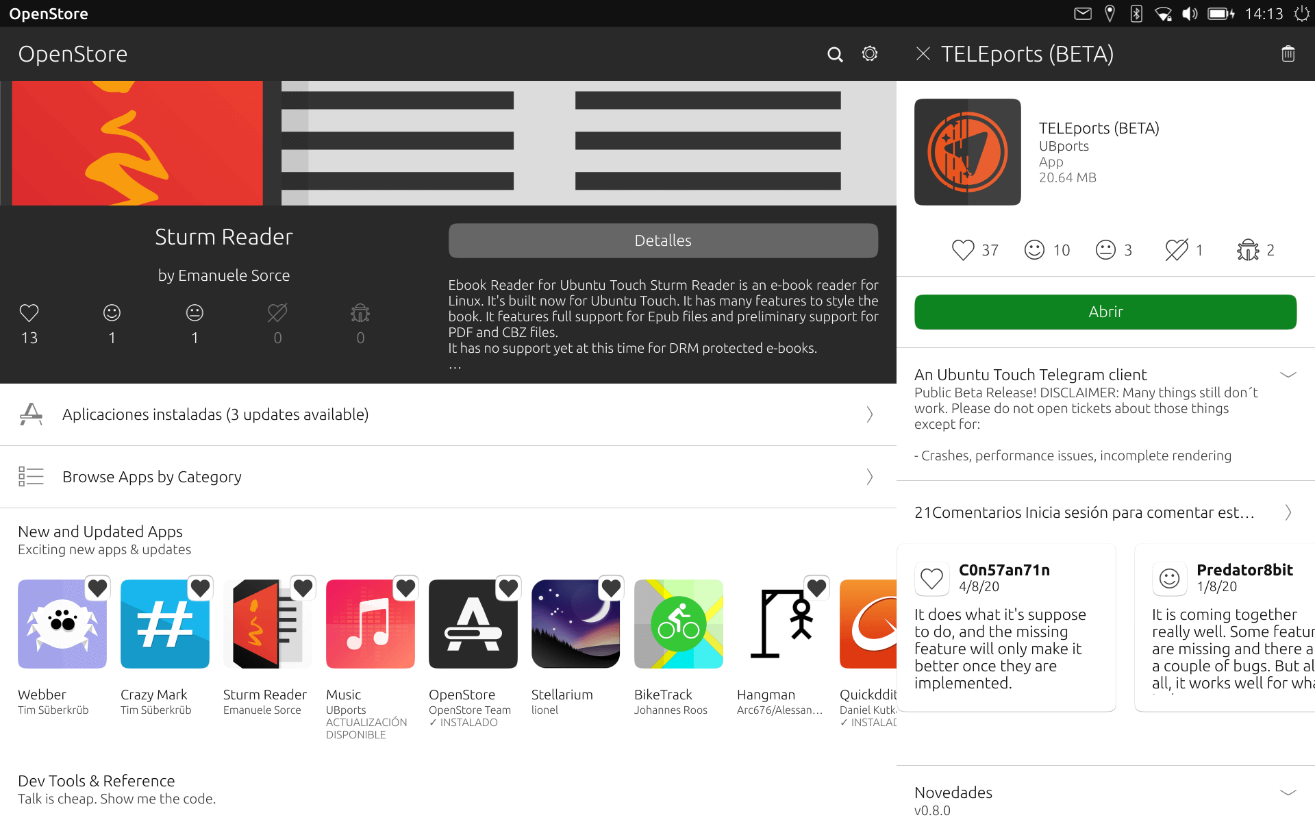 Since TELEports is an unofficial application, could that create problems when using Telegram? Might they block the account, as happens with WhatsApp? The answer to both questions is NO. Unlike WhatsApp (which is owned by Facebook), Telegram does not force its users to use its official client. They have published the specifications and any user can develop their own application. This is made possible by the TDlib development library. In the UBports Q&A 81 broadcast we saw the relationship between this library and TELEports. To install TELEports, all we have to do is open the OpenStore app and look for the application.
