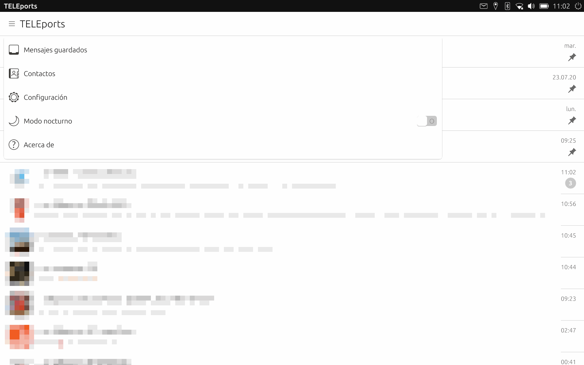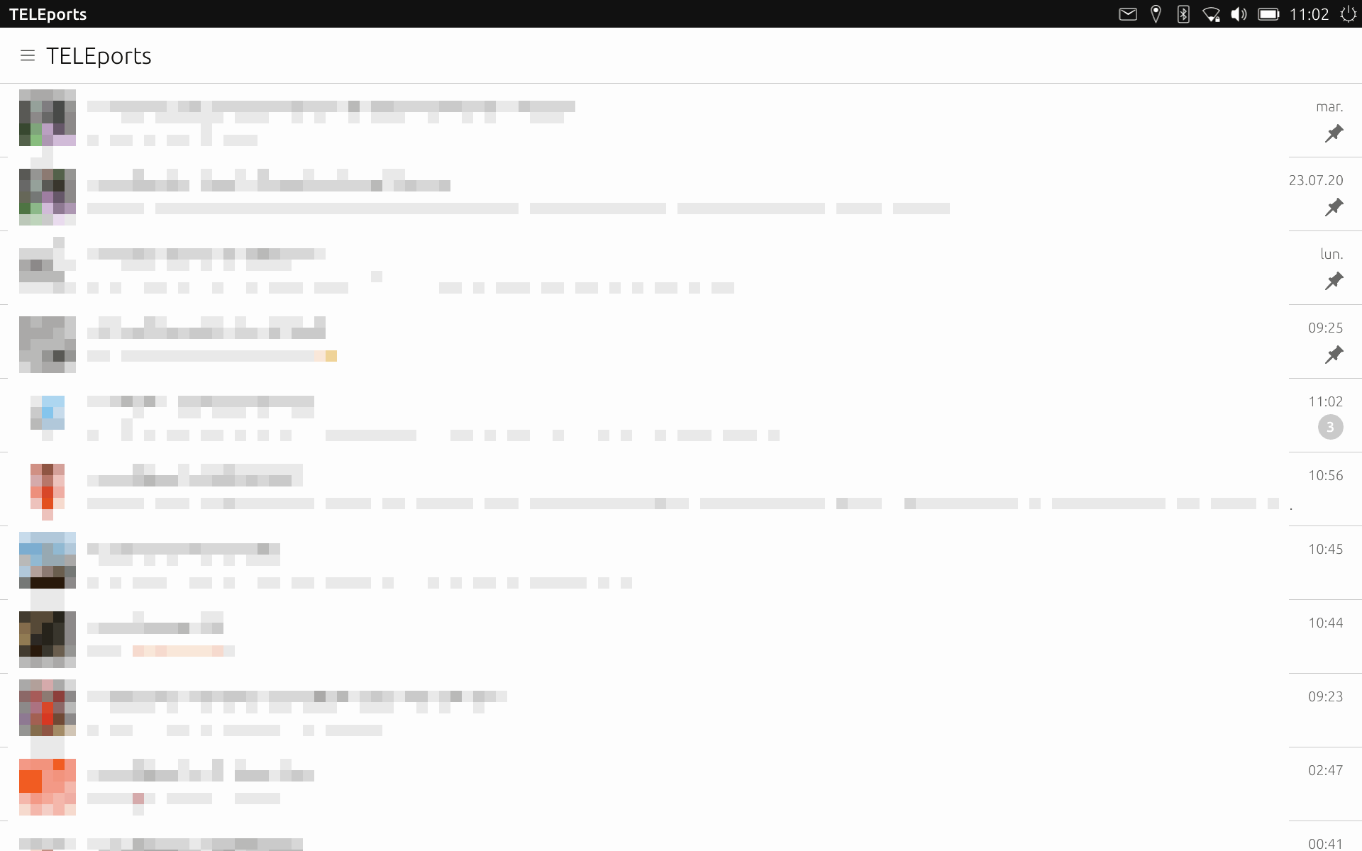 The general appearance of TELEports is similar to that of Telegram clients on other platforms. There is a list of conversations, channels and groups with a bubble showing the most recent message in each. As my screenshots may reveal private information, I have pixelated them for privacy reasons.