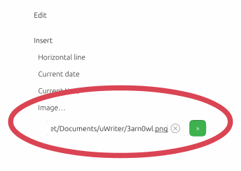 To insert an image into a document, the image itself has to be in the uWriter folder: /home/phablet/Documents/uWriter